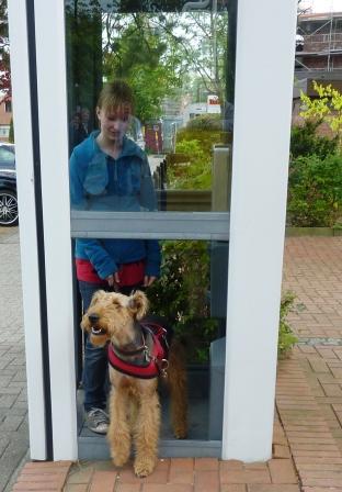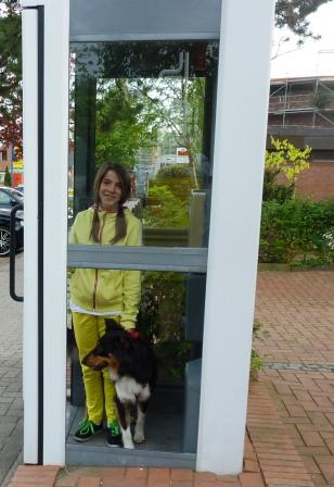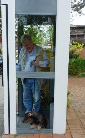 | Auch im Handyzeitalter muß man hin und wieder in die Telefonzelle! Und sei es nur zum Training... (Die Glasscheibe fehlte übrigens schon vor dem Training!) |